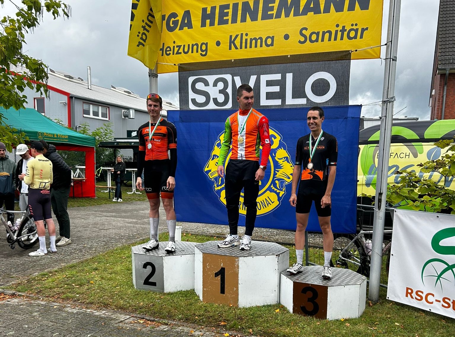 Auch bei Ian gab es Verwirrung: aufgrund von Durcheinander bei der Anmeldung hatten ihn die Veranstalter zur den ebenfalls vormittags startenden Lizenzfahrern gesteckt, und zwar über die Langdistanz von fünf Runden gleich 115 Kilometern. Für Ian (der auch das Kriterium am Vortag gefahren war) startete sein erstes Lizenzrennen also mit viel Regen, schlechter Sicht und über vier von fünf Runden mit Wasser aus allen Richtungen. Gleich von Beginn an Anspannung, nachdem sich eine Ausreißergruppe bilden konnte und im Feld weitere Ausbrüche verhindert wurden, sodass alles ständig in Bewegung war. In dieser Gruppe konnte sich Ian halten, am Ende sein Herz in die Hand nehmen, sprinten – und auf den 2. Platz seiner Kategorie fahren. Als wir ihn nach dem Rennen antrafen, wusste er noch gar nichts von seinem Glück, stand durchnässt und kalt – dann kam die Durchsage, Jubel und Wärme ums Sportlerherz. Bravo Ian!